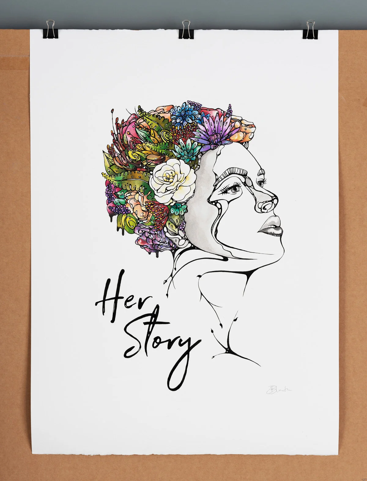 Black's artwork was drawn in ink and watercolour, with "Her Story" brought to life through the use of bold, striking colours – signifying the strength of Kiwi women.